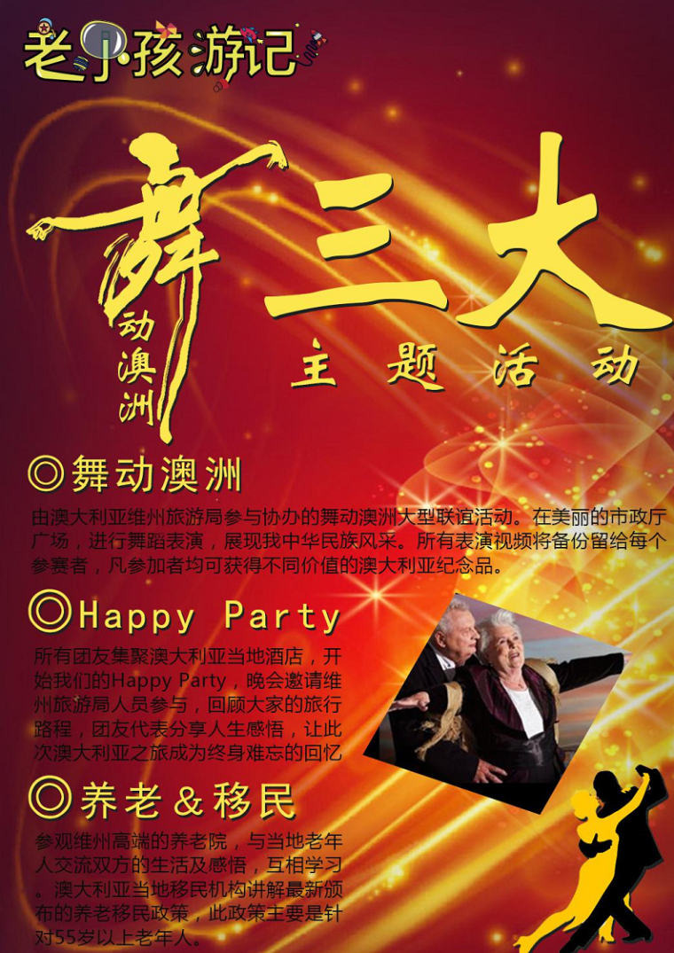 【舞動(dòng)澳洲】由澳大利亞維州旅游局參與協(xié)辦的舞動(dòng)澳洲大型聯(lián)誼活動(dòng)。在美麗的市政廳廣場(chǎng),進(jìn)行舞蹈表演,展現(xiàn)我中華民族風(fēng)采。所有表演視頻將備份留給每個(gè)參賽者,凡參加者均可獲得不同價(jià)值的澳大利亞紀(jì)念品。